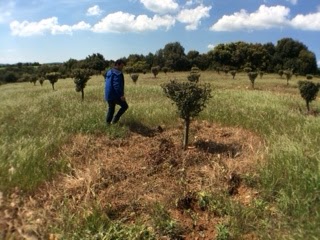 La encina suele mantener hojas de 1, 2 y 3 años y las últimas básicamente respiran y no fotosintetizan, consumiendo los azúcares que generan las hojas nuevas. Así que compiten por los nutrientes con la trufa. En este sentido recomendamos podar las ramas viejas, especialmente dentro de la copa del árbol, para así airearlo. De esta manera se hace más permeable a la lluvia que mojará el quemado de forma homogénea, si no la encina tiende a actuar como un embudo y recoger el agua y canalizarla y mojar la base del tronco.