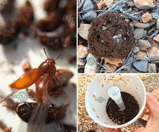 Se puede ver en las fotos un adulto tomando el vuelo, una trufa llena de larvas y una de las trampas con el fondo lleno de adultos.
