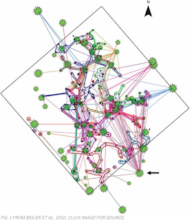 En este dibujo podéis ver esta trama real de conexiones de micelio/micorrizas entre unos abetos y el hongo hipogeo Rhizopogon, y cómo un sólo árbol puede estar conectado con hasta 47 otros.