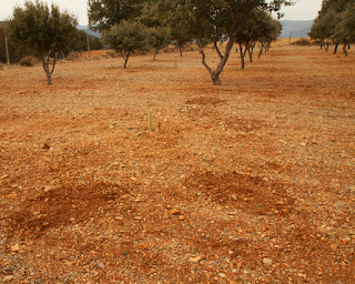 Una encina de una plantación trufera, que una vez muerta por una enfermedad, se ha cortado y en su lugar replantado una carrasca trufera nueva (tubo verde), pero que dos años después de cortada sigue produciendo trufas a su alrededor.